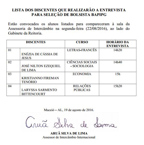 A Assessoria de Intercâmbio Internacional (ASI) da Ufal lança nesta segunda-feira (15) a chamada interna para a seleção de 1(uma) Bolsa Apoio à Pesquisa e Inovação e Pós-Graduação (BAPIPG) ao (a) aluno(a) que realiza atividades de ensino e pesquisa na área de relações internacionais e co-relatas às atribuições da ASI. A seleção do aluno(a) ocorrerá em duas fases: preenchimento de ficha de inscrição acessada pelo endereço eletrônico, abaixo, até dia 19/08(Sexta- feira) às 12h, e entrevista na Assessoria no dia 22/08(Segunda-feira), a partir das 14h conforme lista divulgada dia 19/08 às 18h, com resultado final dia 23/08(Terça-feira). Necessário conhecimento de língua estrangeira. Turno das Atividades: exclusivamente matutino.